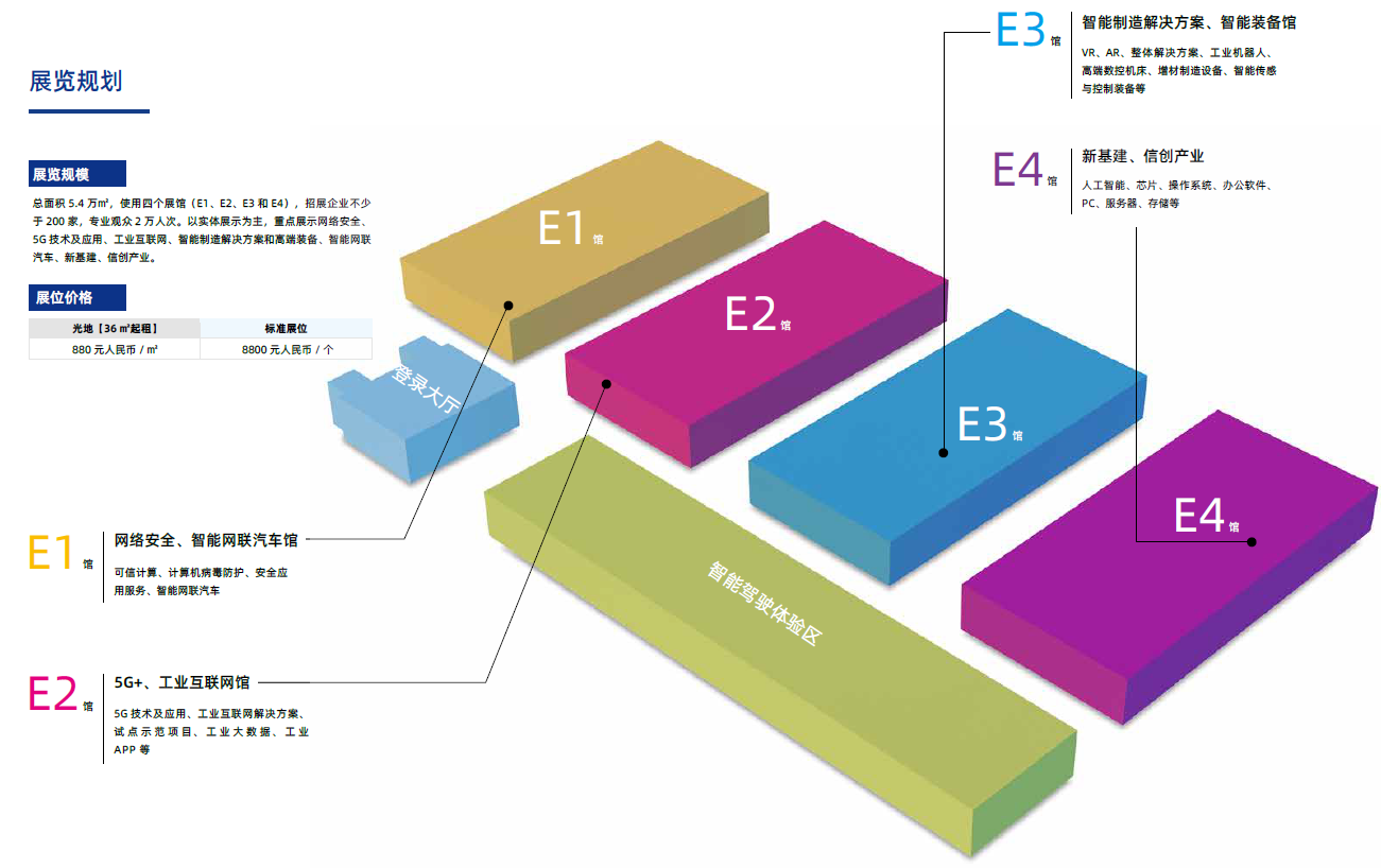 規(guī)模:總面積5.4萬㎡,計(jì)劃使用四個(gè)展館(E1、E2、E3和E4),計(jì)劃招展企業(yè)不少于200家,專業(yè)觀眾2萬人次。以實(shí)體展示為主,重點(diǎn)展示網(wǎng)絡(luò)安全、5G技術(shù)及應(yīng)用、智能裝備、智能網(wǎng)聯(lián)汽車、智能終端及芯片。