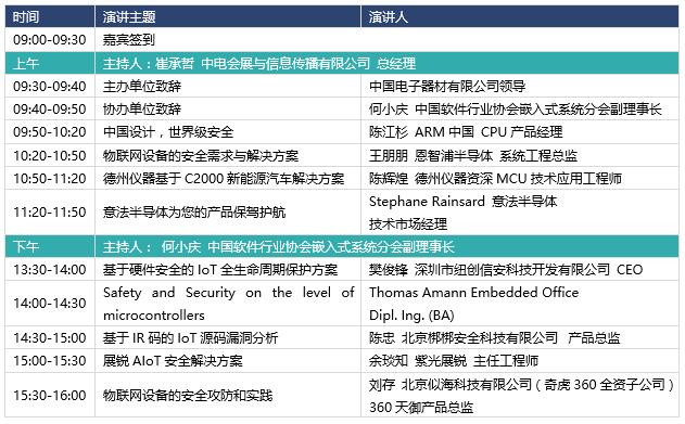 此次論壇邀請了中國軟件行業協會嵌入式系統分會副理事長何小慶、ARM中國 CPU產品經理陳江杉、恩智浦半導體系統工程總監王朋朋、德州儀器資深MCU技術應用工程師陳輝煌、意法半導體技術市場經理Stephane Rainsard、深圳市紐創信安科技開發有限公司CEO樊俊鋒、Embedded Office Dipl. Ing. (BA) Thomas Amann 、北京梆梆安全科技有限公司產品總監陳忠、紫光展銳主任工程師余琰知、北京似海科技有限公司(奇虎360全資子公司)360天御產品總監劉存等國內外行業領先企業、業界專家、行業精英參與演講,聚焦熱點話題,探討AOIT時代物聯網安全。